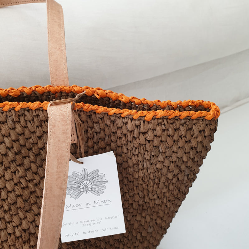 De Julie bag is een hele mooie handgeweven tas van het merk Made in Mada. De tas heeft een leuke oranje stitch aan de bovenrand.