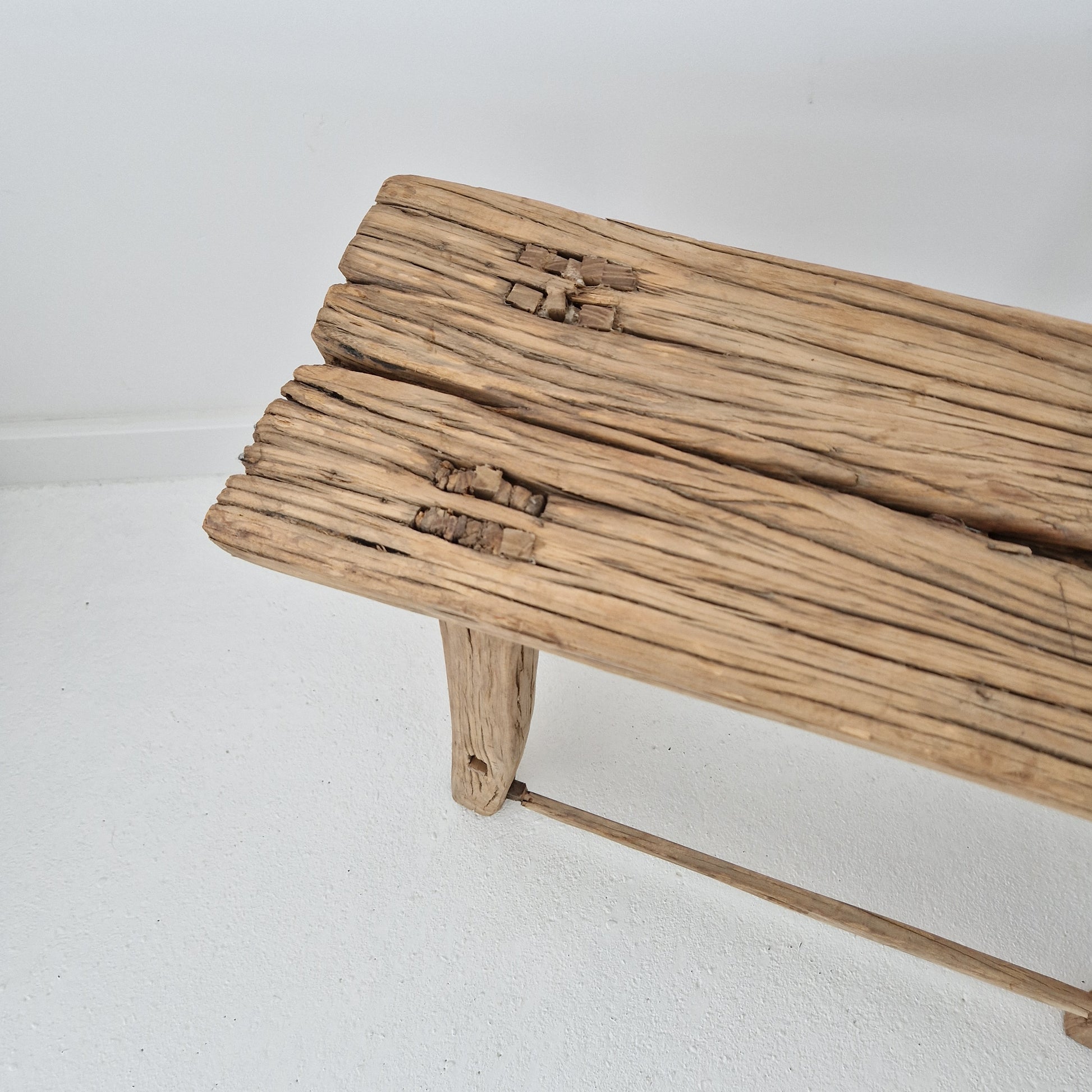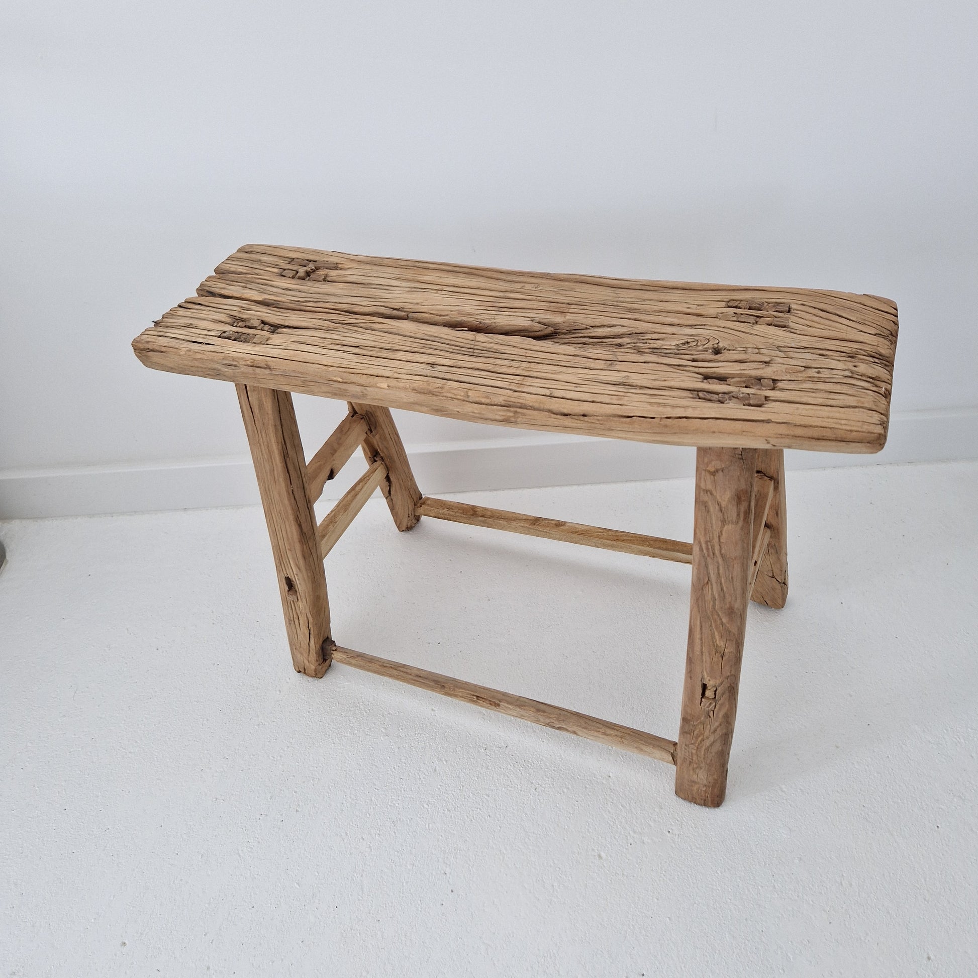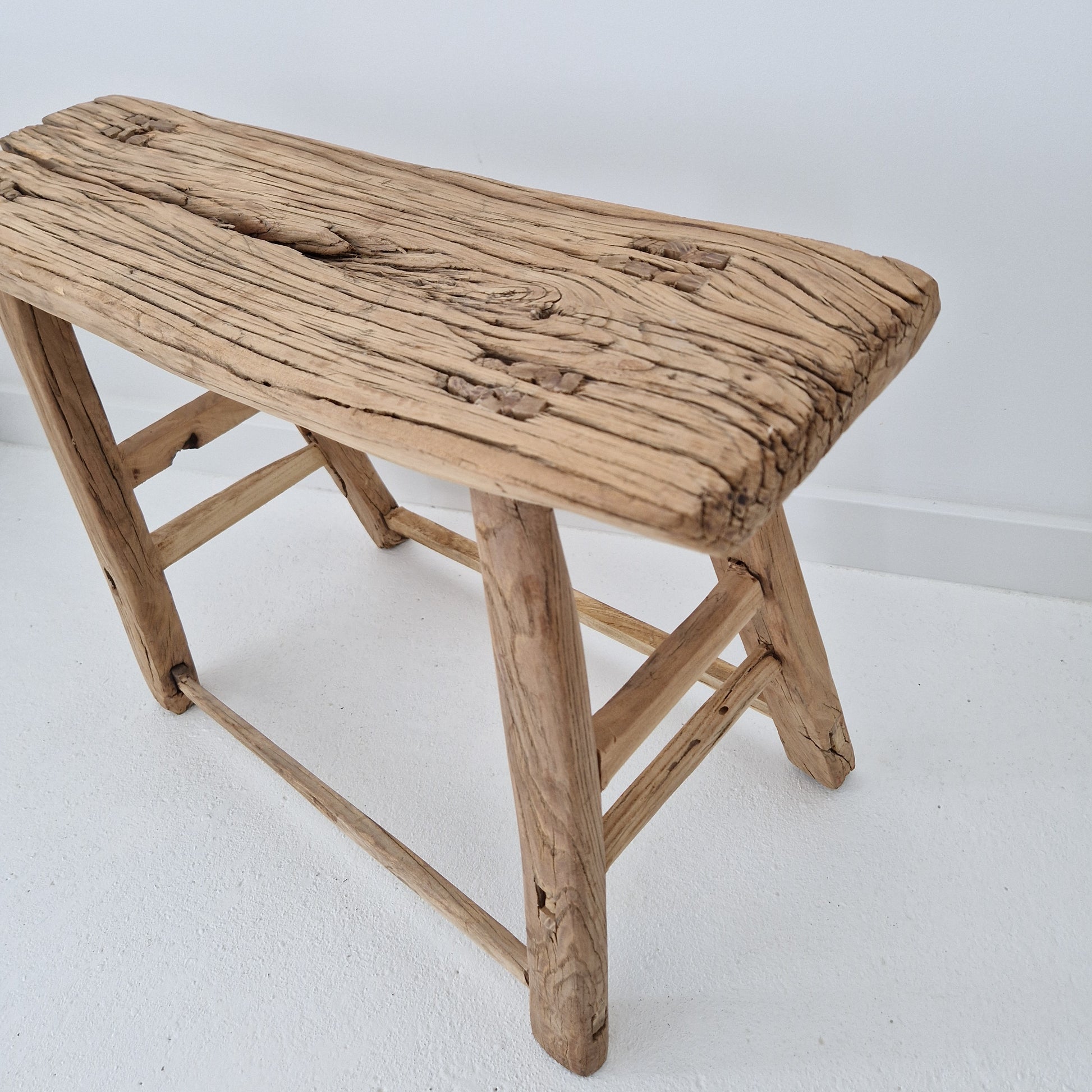 De houten kruk is met de hand gemaakt en heeft door de jaren heen een prachtige verouderde uitstraling gekregen.