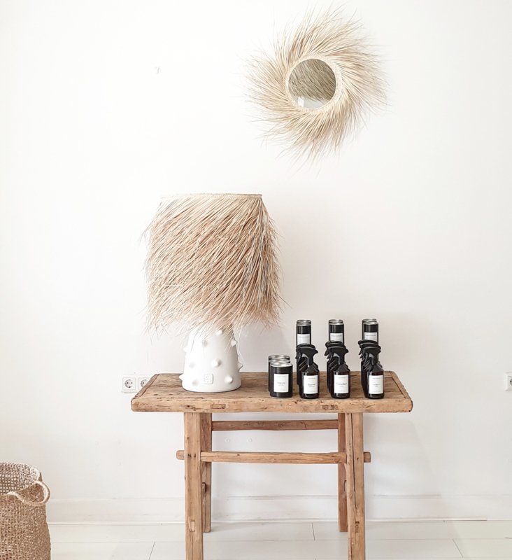 De spiegel is gemaakt van palmleaf, het nieuwe blad kan in het begin nog iets groen zien maar na verloop van tijd zal het palmleaf verkleuren naar Naturel.